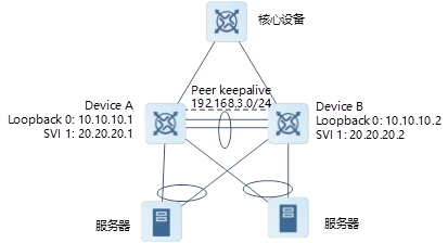 為增強M-LAG設備間數據傳輸的可靠性,同步數據使用TCP傳輸,需要在Peer Link鏈路之上配置一個SVI口,并配置M-LAG主從設備間三層可達,用于設備間同步數據。