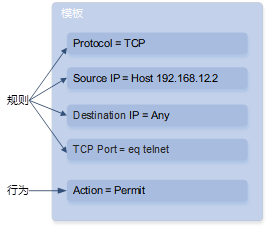 在這條ACE中,過濾域模板為以下字段的集合:源IP地址字段、目的IP地址字段、IP協議字段、TCP目的端口字段。對應的值(即規則)分別為:源IP地址為Host 192.168.12.2、目的IP地址為Any(即所有主機)、IP協議為TCP、TCP目的端口為Telnet。如圖1-1所示。