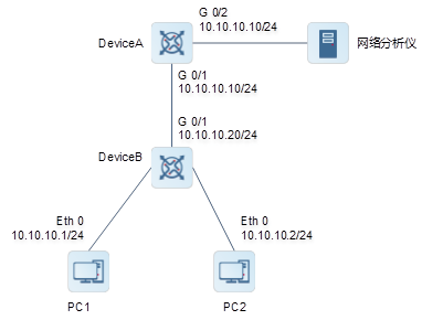 如圖1-7所示,網絡分析儀可以通過遠程鏡像功能,實現在目的設備DeviceB和DeviceC上監控源設備DeviceA上的雙向數據流。且設備之間均能正常交換數據。