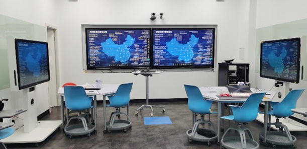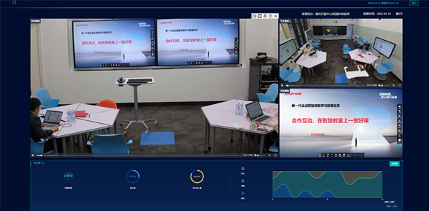 您可以看到實際部署的研討型教室環境,沉浸式體驗硬件大屏使用,優領課全階段教學平臺,督導老師巡課、統一運維等功能。